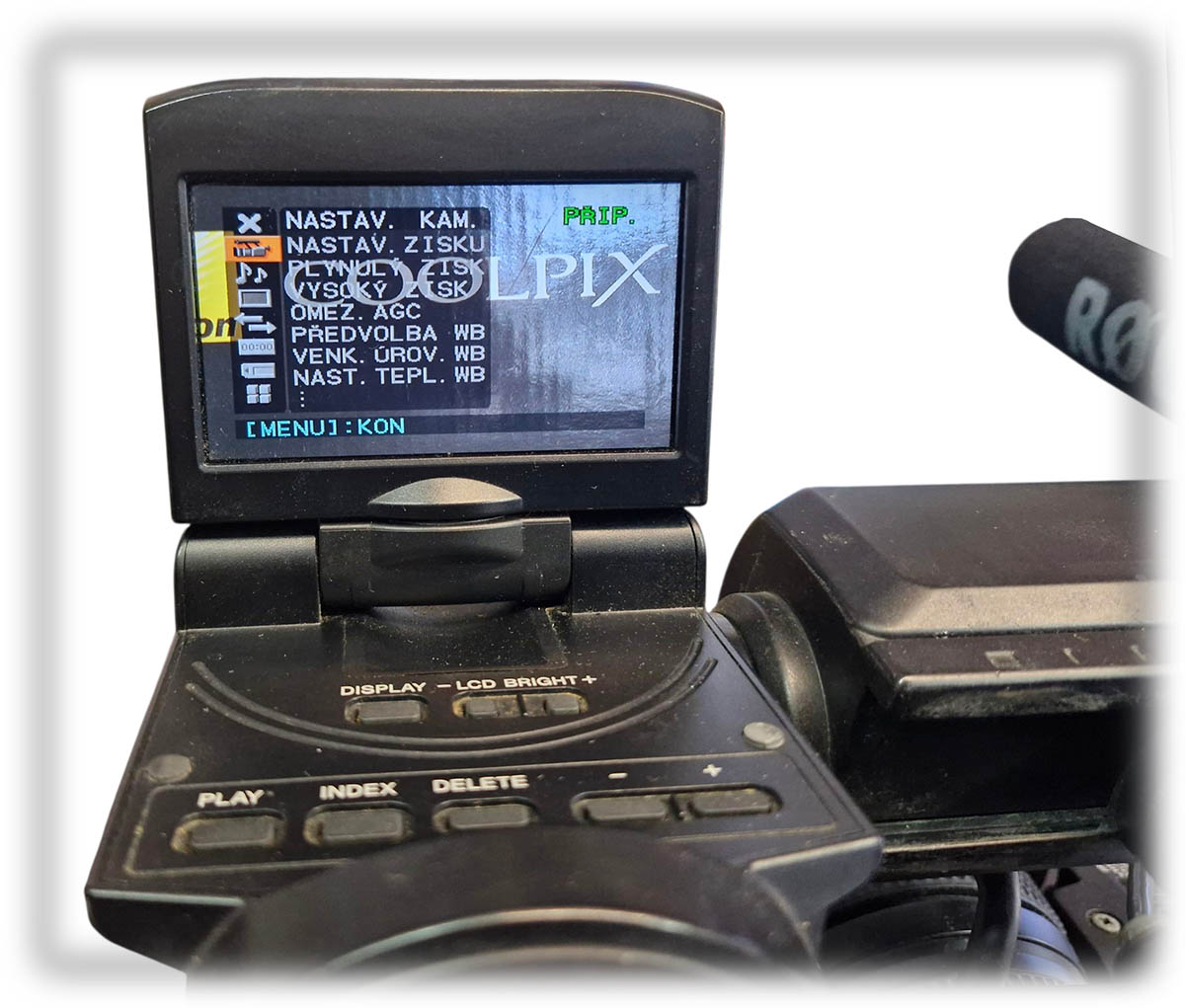 Sony HVR-S270F (<= zajímavá Video-recenze). OBRYNĚ na více velikostí a (záznamových formátů) DV-kazet. Omrkněme krásySony HVR-S270F má v nabídce MENU komplet Češtinu! IMPOZANTNÍ - velmi nekonfekční - Videokamery Sony. Rozměry (Š x V x D, cca) 220 a 270 x 530 mm a hmotností 6,3kg (s obří baterií BP-GL95: zmíním ji níže) jde opravdu o pořádný STROJ. Při uchopení za madlo si jeden uvědomí, že manipulace budou o posilovně. Pravda: POMÁHÁ ramenní opěrka konstrukcí, která odlehčuje hmotu MAŠINY. Čtenář mi asi uvěří, že kamkoli vejdu s takto „muskulaturní“ mašinou, vyvolávám údiv a obdiv, protože NEJVĚTŠÍ KAMERAMAN (to asi nejenom na venkově) je BOREC S NEJVĚTŠÍ STROJOVNOU ze všech přítomných, to dá přece rozum… Mrkající
