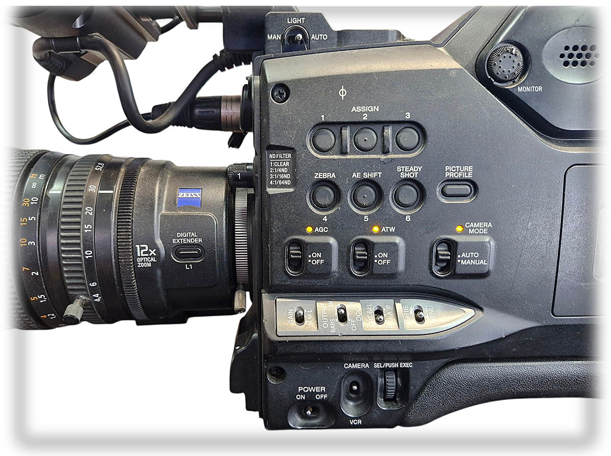 Osazení vévodí tři snímače 1/3“ (<= data na Webu B&H) s 1,12MPx na každém, k před nimiž je Objektiv (kopíruji celý název) Názorný detail přední části Videokamery a objektivu...Carl ZeissVario-SonnarT* s 12násobným přiblížením, třemi prstenci (!) manuálů a obří sluneční clonou s dvojitým mechanismem „vrat“ - coby krytkou s páčkou na levoboku. Výklopný displej sice vyhlíží jako amatérská sranda na „převlečených“ kamerách typu HDR-HD1000, ale obrovitý tubus hledáčku vše usměrní na správnou mez. Na levoboku se po zaučení levička obsluhujícího hračičky může dosyta vyřádit, což „diváci“ z fotek snadno odezírají. Mnohé čtenáře v mládí taky bavilo ovládat bagr, že…